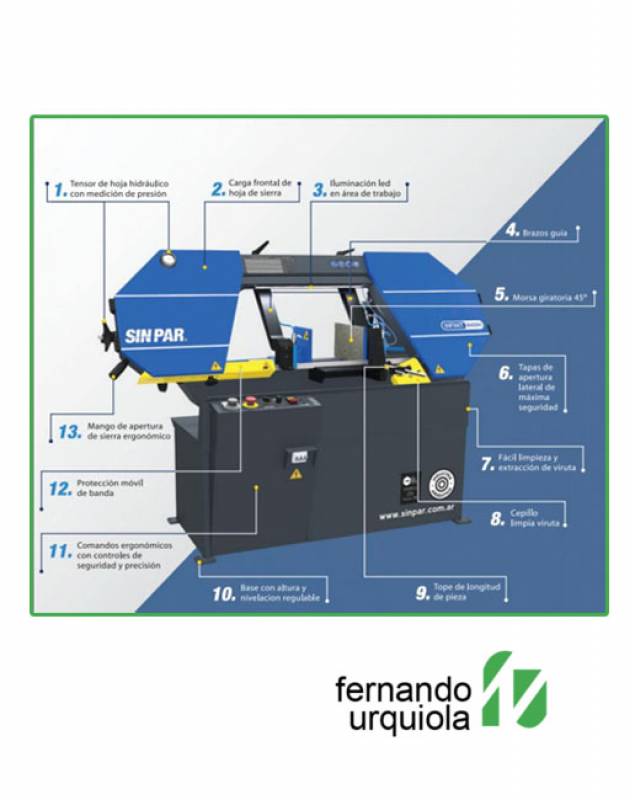 La máquina de sierra de cinta Infinit B400M ofrece funciones revolucionarias gracias a el nuevo sistema de carga frontal y apertura lateral de tapas, único en el mercado argentino. Facilita la operatoria de cambio de banda, eliminando dificultades de manipuleo y brindando mayor seguridad al operador.
