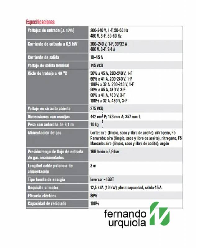 El Powermax45® XP es un sistema de plasma profesional de 45 A para corte, ranurado y marcado, con capacidad de corte recomendada hasta 16 mm, corte de separación hasta 29 mm y perforación hasta 12 mm. Se destacó por su portabilidad, facilidad de uso y alto rendimiento, ofreciendo velocidades de corte superiores al oxicorte y una excelente calidad de acabado, con menos retrabajos.
