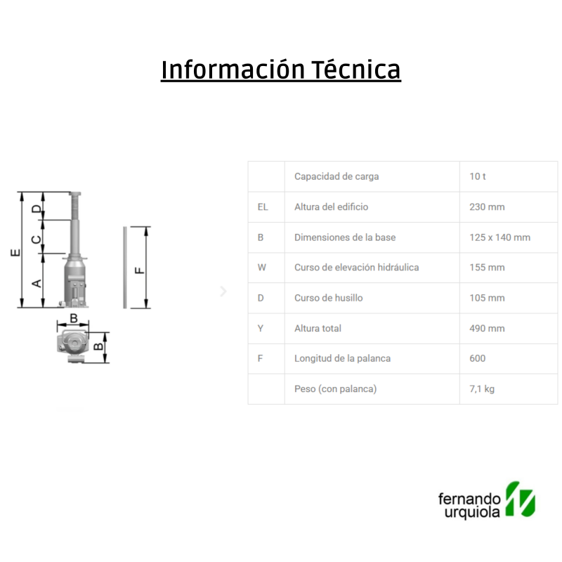 • Gato hidráulico tipo botella, diseñado para la elevación segura de vehículos, facilitando tareas como el cambio de neumáticos en camiones livianos y pesados, furgonetas y remolques.