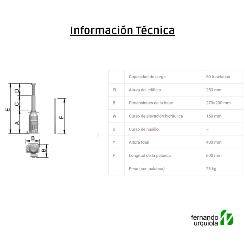 • Gato hidráulico tipo botella, diseñado para la elevación segura de vehículos, facilitando tareas como el cambio de neumáticos en camiones livianos y pesados, furgonetas y remolques.