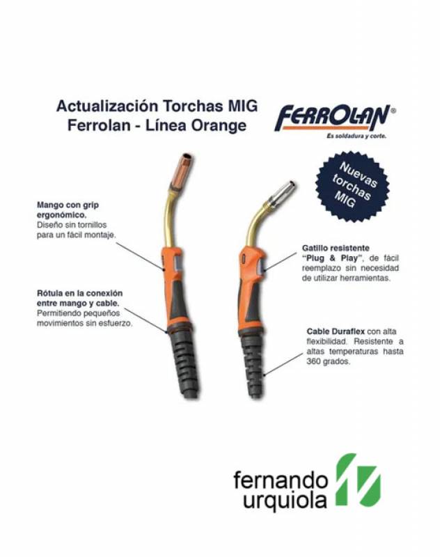 Torcha Mig Mag - Marca: Ferrolan - Modelo: 150 x 3 metros - Linea: Orange - Compatible con todos los equipos Mig con Euroconector - Alambre: 0.6 - 0.8 - 0.9 mm - Peso con 1.5m de cable: 0.95 kg - Conexión: Euroconector - Capacidad: 150 A con mezcla Ar/Co2 180 A con CO2 - Factor de marcha: 60 - Refrigeración: Natural PRINCIPALES CARACTERÍSTICAS: - Intercambiable con la mayoria de las marcas Europeas. - Mango ergonomico. - Muelle de acero anterior y posterior - Rotula para facilitar la curvatura del cable